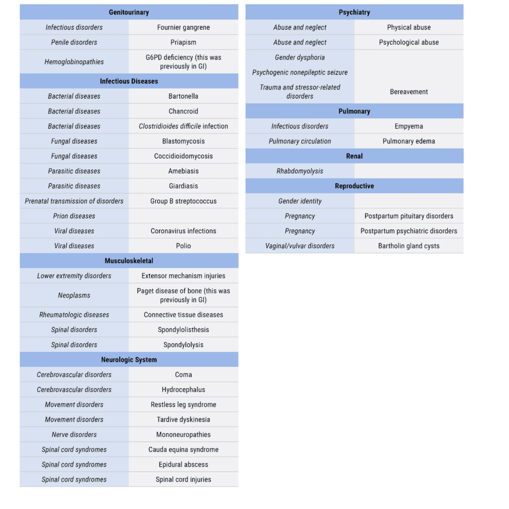 You may also find that topics are reorganized (finally asthma is in obstructive disorders where it belongs) or topics that you may have been taught previously but didn’t have a home are now given one. For example, refeeding syndrome and tardive dyskinesia are sometimes quickly tacked onto a psychiatry lecture. Now both of these topics have a home in GI and neuro, respectively.