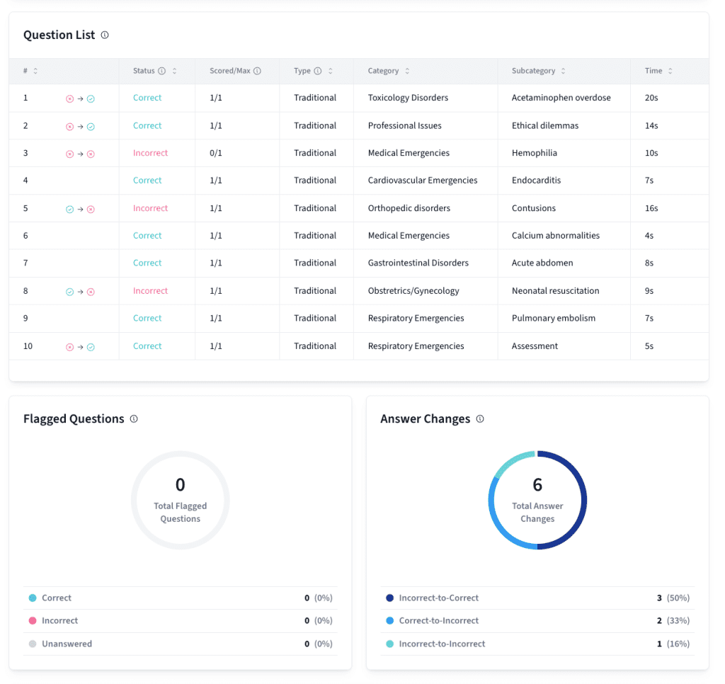 After completing your practice questions, head over to your analytics dashboard to check out how you did! You can view your performance by question category and identify any knowledge gaps that you’ll want to go back and review during your next practice exam. You also have the option to see which questions you changed!
